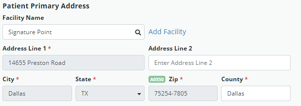 To automatically populate facility information on claims, a facility must be identified as the patient’s primary address or visit address in the Demographics section of the patient’s chart.