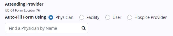 Select Physician, Facility or User and search for the appropriate physician, facility or user. Select Hospice Provider to auto-fill the fields with information from Company Setup.