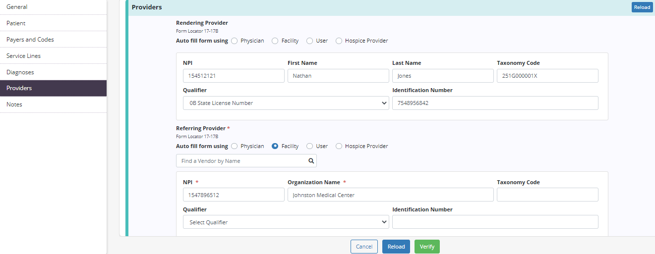 Navigate to the Providers tab on the left side of the Claim window. Provider information will automatically populate based on information in the payer setup and patient chart.