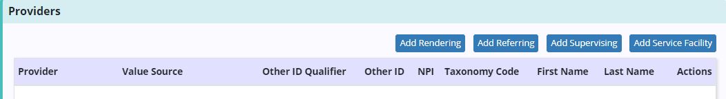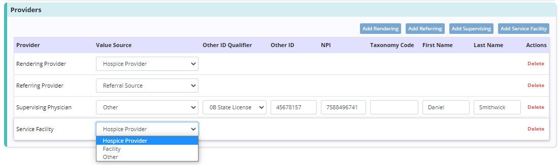 Each provider type has set value sources that will populate documented information to the claim for each patient. Users can select Other for any provider type to add the provider details manually.