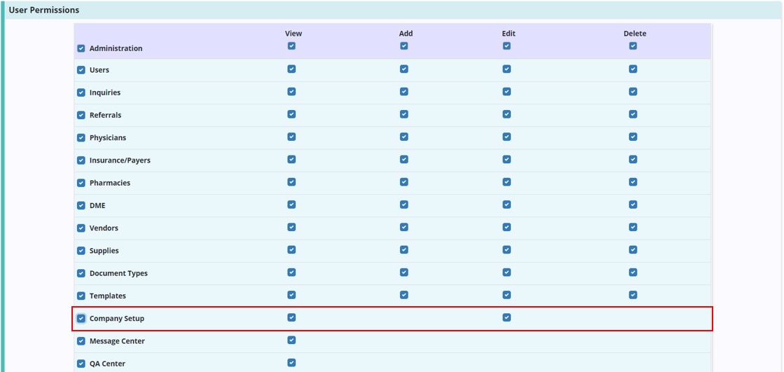 Administrators can also grant users permission to edit Company Setup information. By default, users will not have this permission. Administrative users must grant the Company Setup permission to the appropriate users.