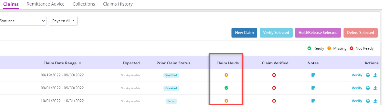 If the eight hours of continuous care have been met, the Claim Holds column will display a green success icon (unless other holds are on the claim).