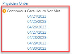 Hover over the icon in the Claim Holds column to view the billing hold details. The dates that did not meet the continuous care requirements will appear under the hold. Click on a date to navigate to the task note.
