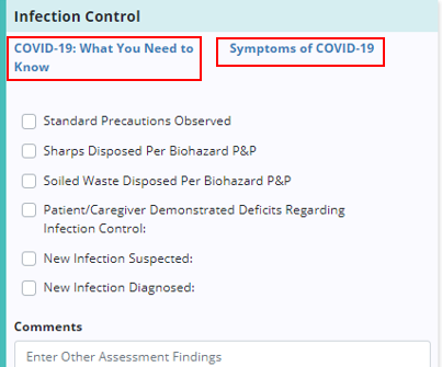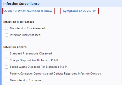 In the RN Initial Assessment, RN Initial/Comprehensive Assessment, RN Comprehensive Assessment and RN Recertification Assessment, these links appear in the Infection Surveillance section: