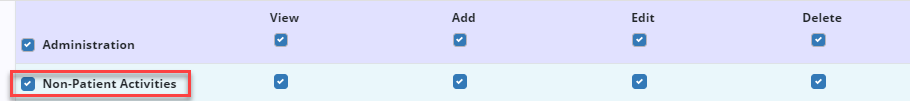 To give a user permission to view, add, edit and delete non-patient activities, edit the user’s profile and navigate to the Permissions tab. In the Administration section, select View, Add, Edit and Delete next to the Non-Patient Activities permission. Click Save to finish granting the permissions to the user.