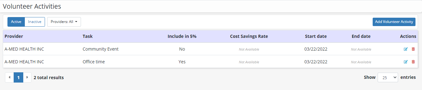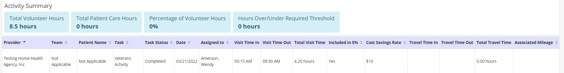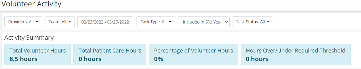 The report displays a list of all activities provided by volunteers for a given date range. The summary at the top of the report displays the total number of volunteer hours, total patient care hours, percentage of volunteer hours, cost savings rate and number of volunteer hours over/under the 5% threshold.