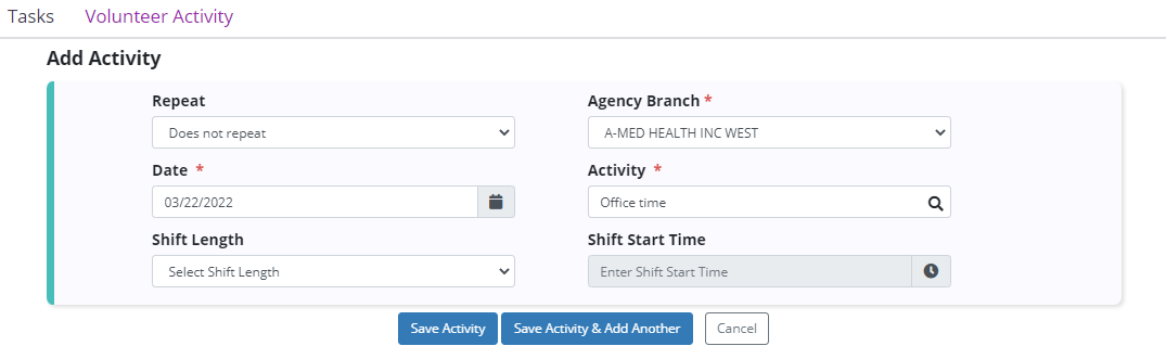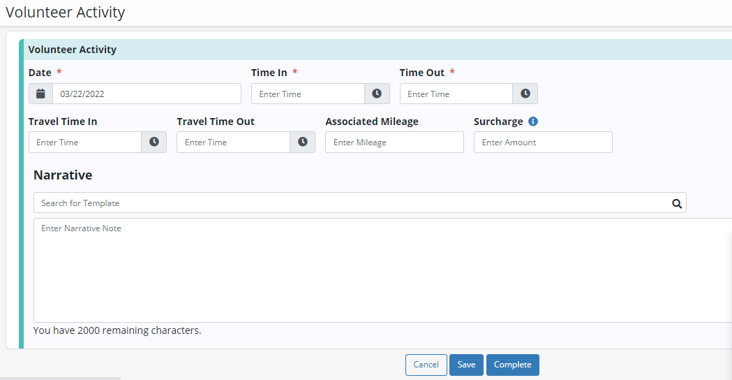 Once the activity is scheduled to a volunteer, the volunteer can document the following information: