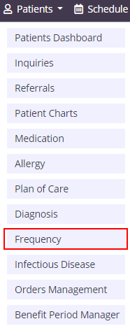 To delete a patient’s visit frequency, navigate to the Frequency page by selecting Frequency under the Patients tab or in the patient’s chart.