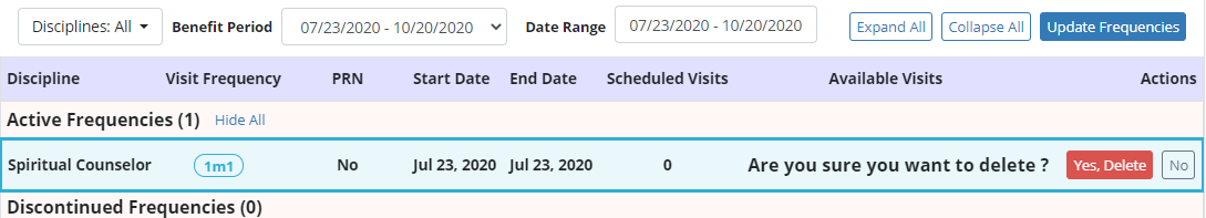 under Actions on the Frequency page. To delete a frequency, select the trash can icon and click Yes, Delete to remove the frequency.
