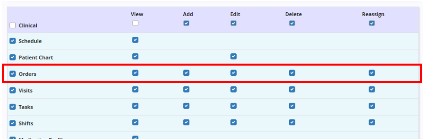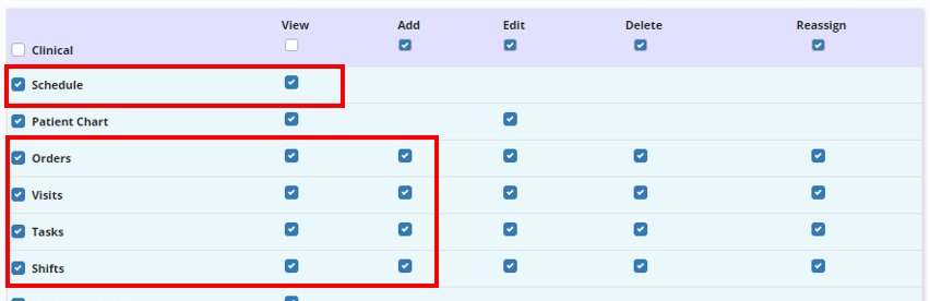 To schedule tasks, users need View and Add permissions for Schedule, Orders, Visits, Tasks and Shifts, which are also found in the Clinical section of the Permissions tab in the user’s profile.