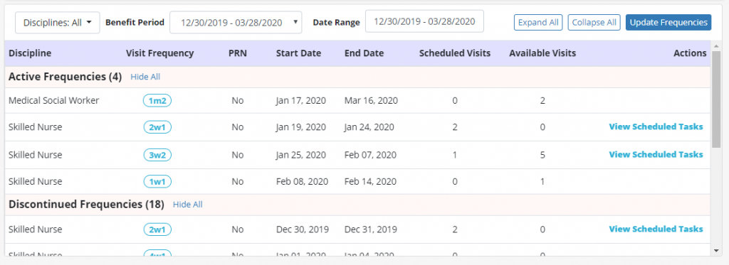 The patient’s Frequency Profile will open to display the Discipline, Visit Frequency, PRN status, Start Date, End Date, Scheduled Visits, and Available Visits remaining for each Active and Discontinued Frequency.