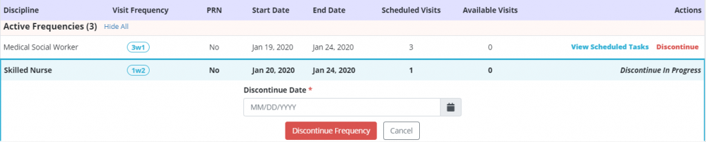 Actions for existing frequencies include Discontinue and View Scheduled Tasks. Selecting Discontinue will prompt you to enter a discontinue date for the frequency. If you click this by mistake, click Cancel and the frequency will not be discontinued.