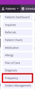 Frequencies can also be added and updated from the Frequency page. To access the Frequency page, navigate to the Schedule tab and select Frequency from the drop-down menu, or navigate to the Patient Charts and select Frequency from the Actions menu.