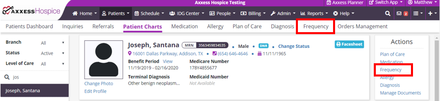 Patients tab ➜ Patient Charts ➜ Actions menu ➜ Frequency