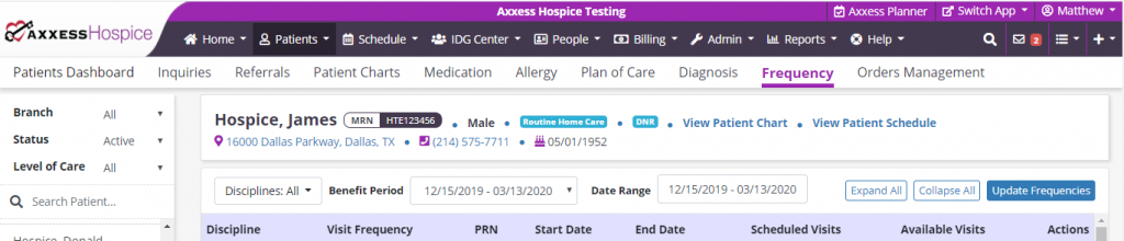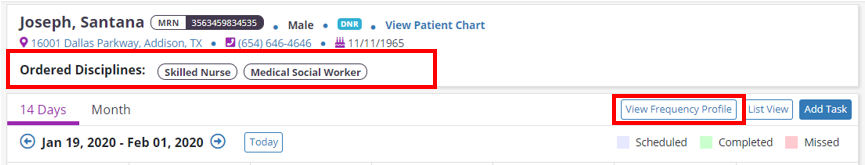 The Patient Schedule displays ordered disciplines across the top. Click the View Frequency Profile button to navigate to the patient’s Frequency page and view the patient’s ordered frequencies. The software will provide information about each frequency as you schedule tasks.