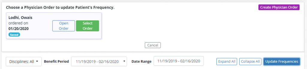 When updating frequencies here, the software will attach the updates to an existing Physician Order or prompt you to create a new Physician Order from that screen. Once an order has been selected or created, follow the above steps to add or update the Frequency Profile.