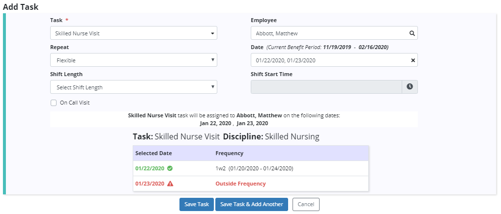 Click Add Task to schedule tasks for this patient. Once you have selected a task and desired dates for the task, a window will display how the task matches up to the ordered frequency. A green check will appear next to the task if it falls within the frequency, and a red x will appear next to the task if it exceeds the ordered frequency. Once all your tasks are within the ordered frequency, click Save Task or Save Task & Add Another to add the tasks to the patient’s schedule.