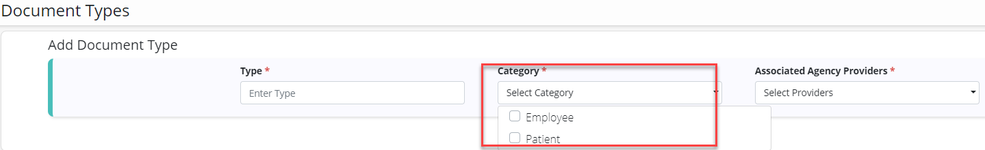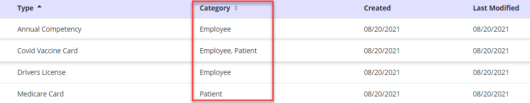 Document types categorized as patient documents will appear when adding documents to patient profiles. Document types categorized as employee documents will appear when adding documents to employee profiles.