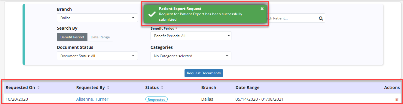 When Request Documents is clicked, a green success message will confirm that the export was requested, and the columns will update to display the following information: