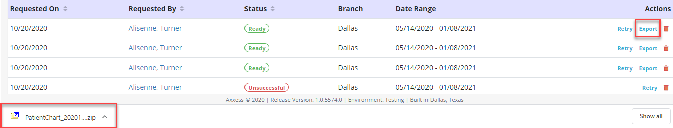 When the documents are ready to export, the Status column will say Ready. Users can click Retry, Export or