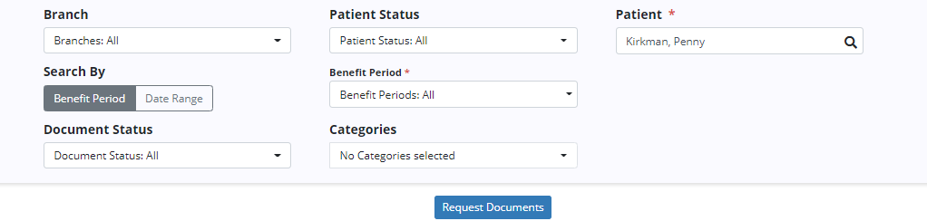 Patient and Benefit Period are required fields. Select the patient, benefit period and any other desired criteria, and click Request Documents to generate patient documents based on your search parameters.