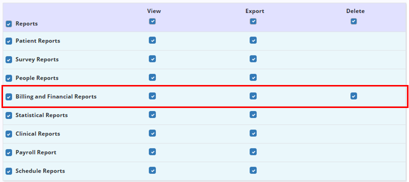 To enable the user to export and/or delete billing and financial reports, select Export and/or Delete next to the Billing and Financial Reports permission. Once the appropriate permissions have been selected, click Save to finish granting the permissions to the user.