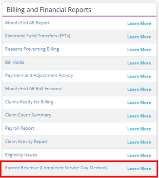 To generate the Earned Revenue report, navigate to the Report Center under the Reports tab. In the Billing and Financial Reports section, select Earned Revenue (Completed Service Day Method).