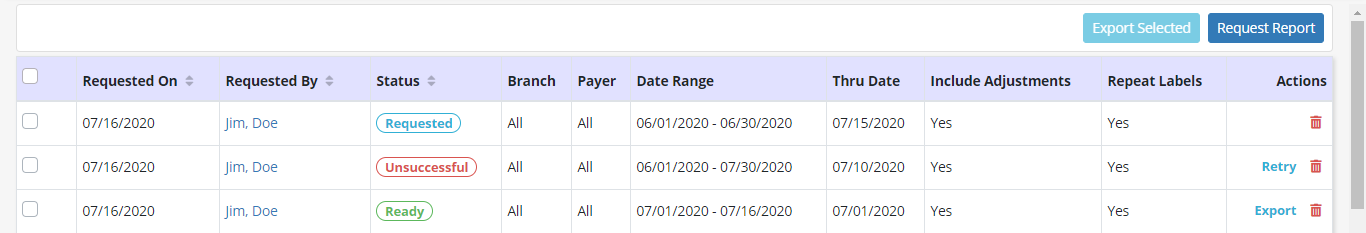 | Unsuccessful | Indicates that the report request was unsuccessful and can be re-attempted by selecting Retry under Actions |