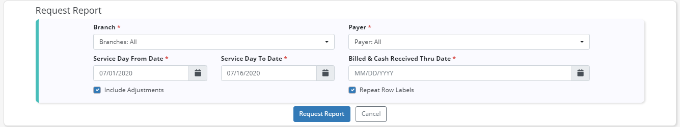 Depending on the amount of data, the Earned Revenue report may take several minutes to generate. To generate the report, select Request Report at the top of the screen. Complete the parameter fields in the Request Report window and check the respective boxes to include adjustments and/or repeat row labels in the report.