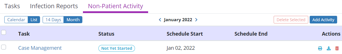When a user has made an error on a non-patient activity, the activity can be deleted if it has not been exported to payroll. To delete a non-patient activity, navigate to the Non-Patient Activity tab in the employee’s schedule and click the trash can icon next to the appropriate activity.
