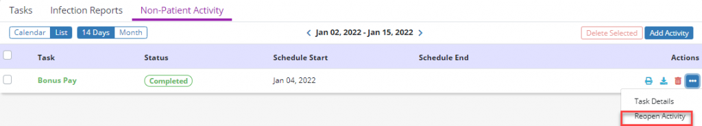 To edit a non-patient activity, navigate to the Non-Patient Activity tab in the employee’s schedule. Next to the appropriate activity, click on the three-dot menu and select Reopen Activity.