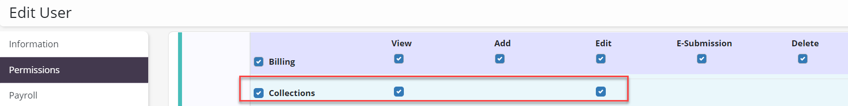 To give a user permission to view and edit collections, edit the user’s profile and navigate to the Permissions tab. In the Billing section, select View and Edit next to the Collections permission. Click Save to finish granting the permissions to the user.