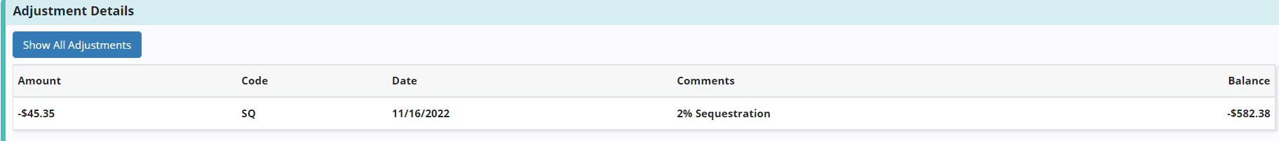 Adjustments appear in the Adjustment Details section based on the date, amount code, comments and the remaining balance entered.