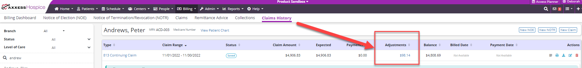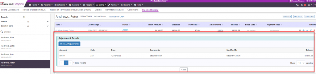 Axxess Hospice now enables users to edit outstanding claims from the Collections screen. When editing an outstanding claim, users can view payment and adjustment activity and add adjustments.