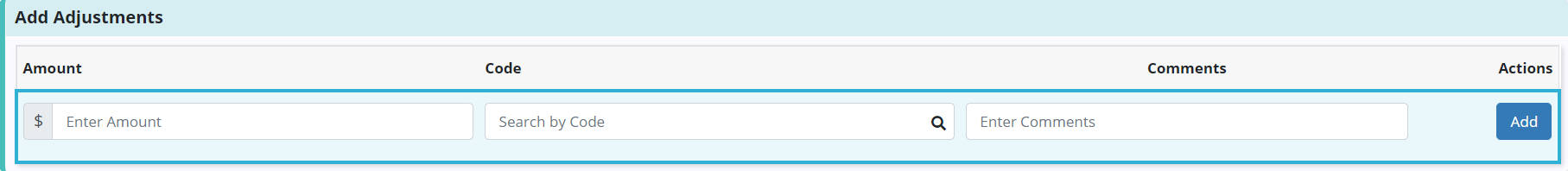 To add an adjustment, scroll to the Add Adjustments section. Enter the amount, code and any applicable comments, and click Save.