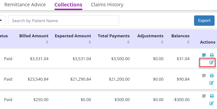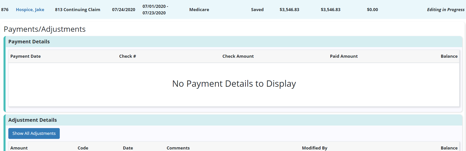 When the edit icon is selected, the Payments/Adjustments window will open to display all payments and adjustments made on the claim.
