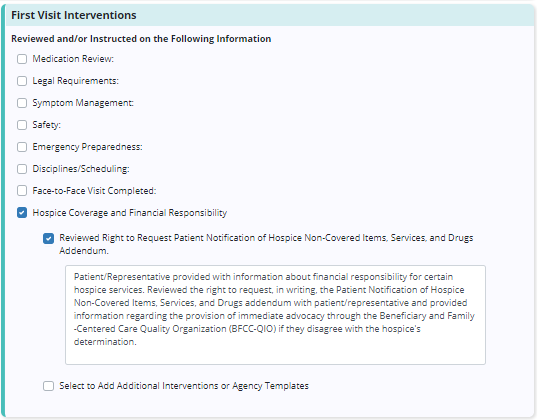 To document the review of these rights, navigate to the First Visit Interventions section in the assessment and select Hospice Coverage and Financial Responsibility. Select Reviewed Right to Request Patient Notification of Hospice Non-Covered Items, Services, and Drugs Addendum. Enter the information reviewed with the patient or caregiver.