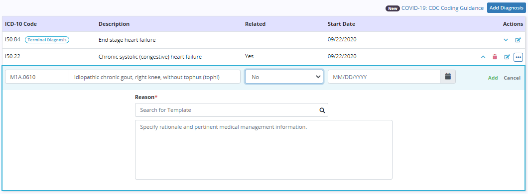 Diagnoses are added in the patient chart on the Clinical Information tab. When a new diagnosis is added and a new terminal diagnosis is selected for the patient, select Yes or No from the Related drop-down menu to indicate if the diagnosis is related to the patient’s terminal diagnosis. If No is selected, document the rationale and any pertinent medical management information.