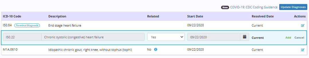 The relatedness status of a diagnosis can be updated at any time by selecting the edit icon next to the diagnosis. However, users still must have a physician order to add, resolve or update other details of a diagnosis.