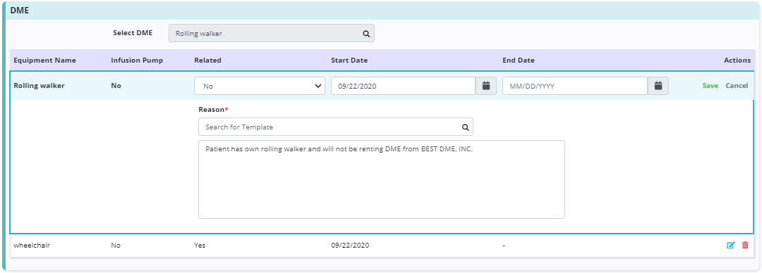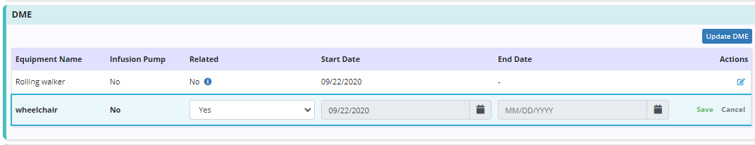 The relatedness status of DME can be updated at any time by selecting the edit icon next to the DME. However, users still must have a physician order to add, discontinue or update other details of DME.