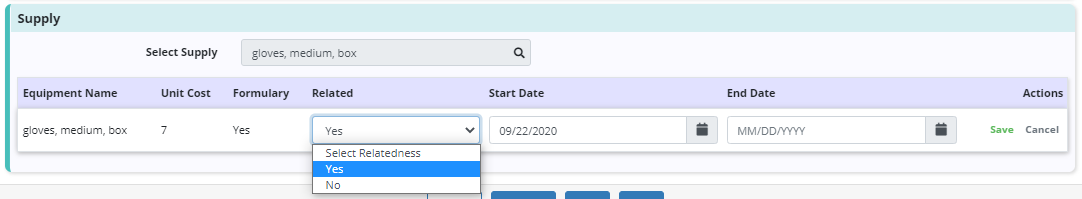 Supplies are added in the patient chart on the Pharmacy and DME tab. When new supplies are added, users can now select Yes or No from the Related drop-down menu to indicate if the supplies are related to the patient’s terminal condition. If No is selected, document the rationale and any pertinent medical management information.