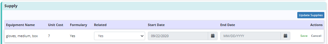 The relatedness status of supplies can be updated at any time by selecting the edit icon next to the supplies. However, users still must have a physician order to add, discontinue or update other details of supplies.
