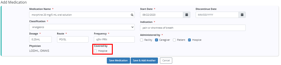 Medications are added in the Medication Profile. When new medications are added, users can now select whether a medication is covered by the organization or not in the Covered By section of the Add Medication form.