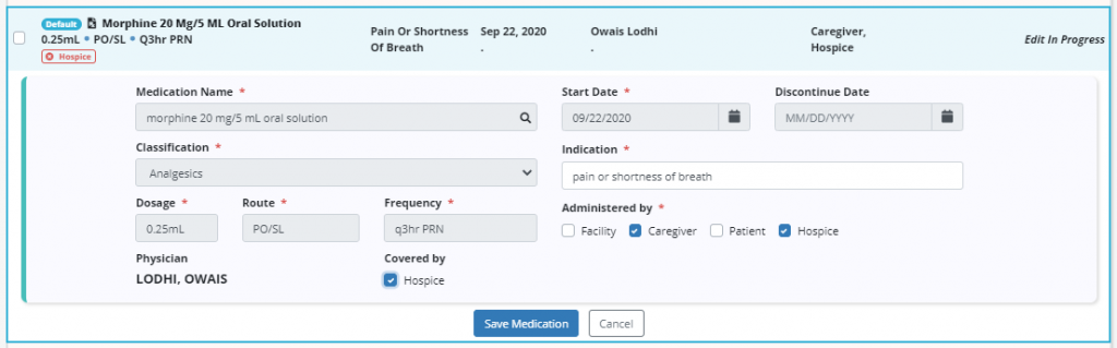 The Covered By status of a medication can be updated at any time by selecting Edit next to the desired medication. However, users still must have a physician order to add, discontinue or update other details of medications.