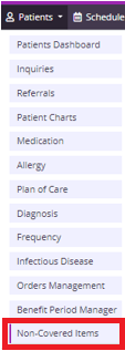 To generate a Patient Notification of Hospice Non-Covered Items, Services, and Drugs addendum, navigate to the Non-Covered Items page in the patient’s chart under Quick Links, or select Non-Covered Items under the Patients tab.
