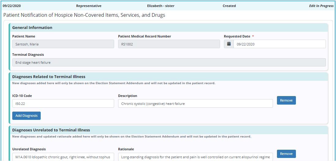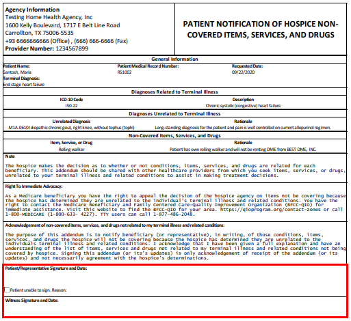 Once created, the Patient Notification of Hospice Non-Covered Items, Services, and Drugs form will pre-populate with the following information:
