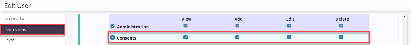 To give a user permission to manage consents, edit the user’s profile and navigate to the Permissions tab. In the Administration section, select View, Add, Edit and Delete next to the Consents permission. Click Save to finish granting the permissions to the user.