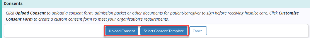Click Upload Consent to upload your organization’s consent forms, admission packet or other documents for the patient/caregiver to sign, or click Select Consent Template to select a built-in consent template to customize.