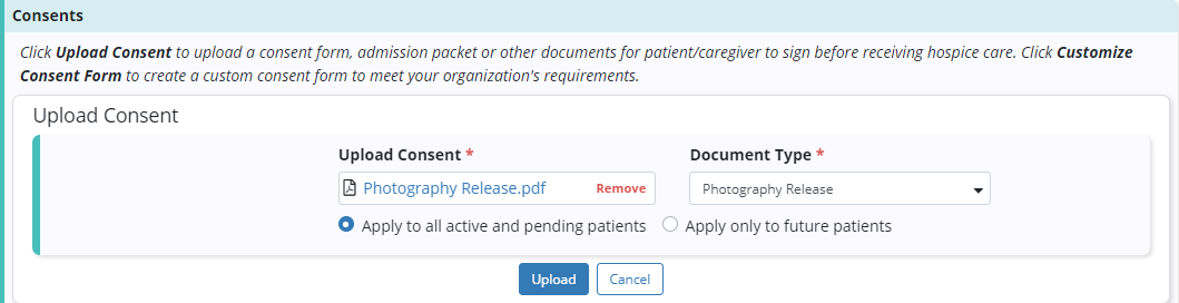 If you select Apply only to future patients, the consent form will only be available to patients entered in the system after the consent was uploaded.