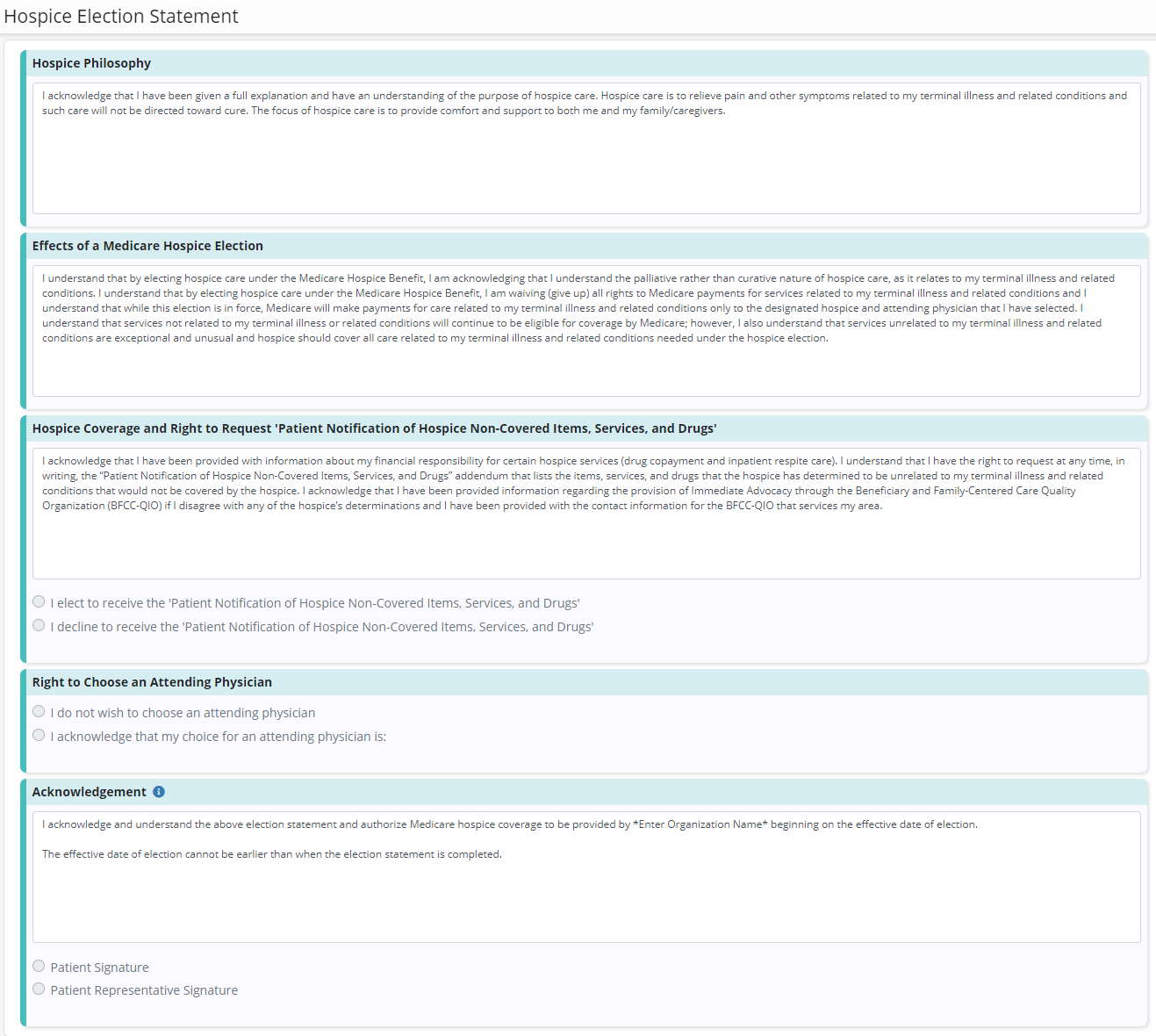 The patient/representative is also required to acknowledge their choice of physician or decline choosing an attending physician.